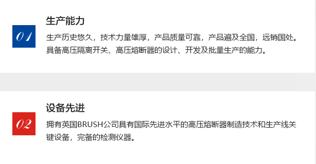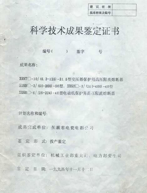 撫順電瓷廠電瓷電器公司是原機械工業(yè)部定點生產(chǎn)高壓隔離開關、高壓熔斷器、絕緣子、避雷器的骨干企業(yè)之一。生產(chǎn)歷史悠久,技術力量雄厚,產(chǎn)品質量可靠,產(chǎn)品遍及全國,遠銷國處。具備高壓隔離開關、高壓熔斷器的設計、開發(fā)及批量生產(chǎn)的能力。擁有英國BRUSH公司具有國際先進水平的高壓熔斷器制造技術和生產(chǎn)線關鍵設備,完備的檢測儀器。能夠批量生產(chǎn)符合國家和國際標準的3.6kv-40.5kv各種規(guī)格的戶內(nèi)外高壓隔離開關、高壓限流熔斷器系列產(chǎn)品。產(chǎn)品在國家高壓電器質量監(jiān)督檢測中心通過全部型式并取得了兩部鑒定和型號證書,是國家經(jīng)貿(mào)委城農(nóng)網(wǎng)改造的推薦產(chǎn)品,通過了ISO9002國際質量體系認證,曾榮獲機械部科技進步二等獎和地方優(yōu)秀新產(chǎn)品獎。